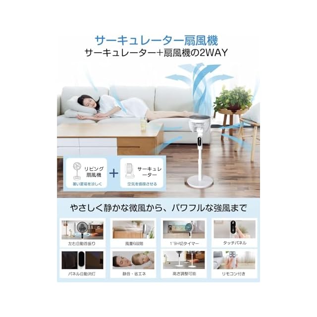 商品名:扇風機 サーキュレーター 兼用【2025モデル・首振り・節電対策】1台多役 リビング扇風機 省エネ 風量6段階 パワフル送風 大風量 60秒パネル自動消灯 リモコン付き 換気扇 タイマー付き 高さ調節可能 1.8M電源コード 24畳 お手入れ簡単 オールシーズン活躍 冷房/暖房 空気循環 換気 梅雨 衣類乾燥 せんぷうき PSE認証済み 日本語取扱説明書付き