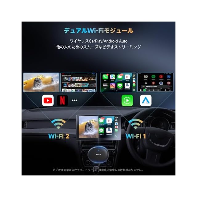 デュアルWi-Fiモジュール: 一方はワイヤレスCPAA用、もう一方はインターネット接続用。YouTubeやNetflixをプリインストール、Spotifyは FindAppsからダウンロード可能。スムーズなナビと通話が楽しめます