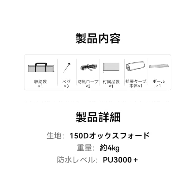 【ご注意】本品はBLACKDOG「天宙」モデル自立式タープ専用の拡張タープです。他製品には適合致しませんので、ご購入前にお確かめください。1台の天宙に対し、理論上最大4張りの拡張テントを接続可能です。