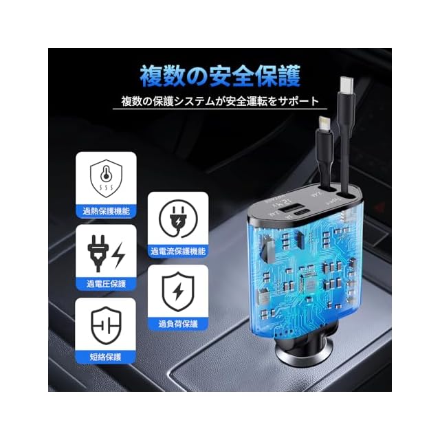 商品名:車 充電器 シガーソケット USB【巻き取り式】カーチャージャー 4in1 車載充電器 巻き取り式ケーブル Type-C100W/20W急速充電 4台同時充 電 iPhone16/15/14/13/12 Galaxy S22/S21 UItra Xperia iPad AQUOSなど LED表示電圧 DC12-24V車対応