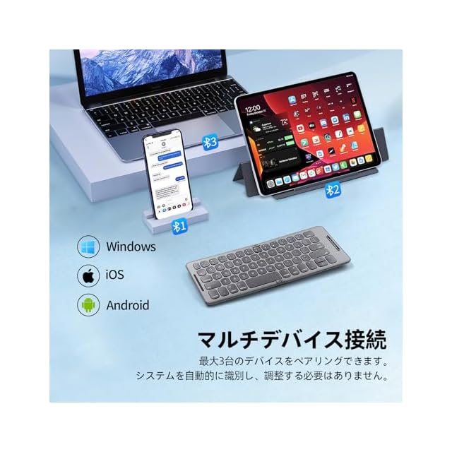 【3デバイス同時接続】Bluetooth 5.1で最大3台まで同時接続可能。Windows/Mac/iOS/Android対応で、iPad・スマホ・タブレット・PC間をシームレスに切り替え。