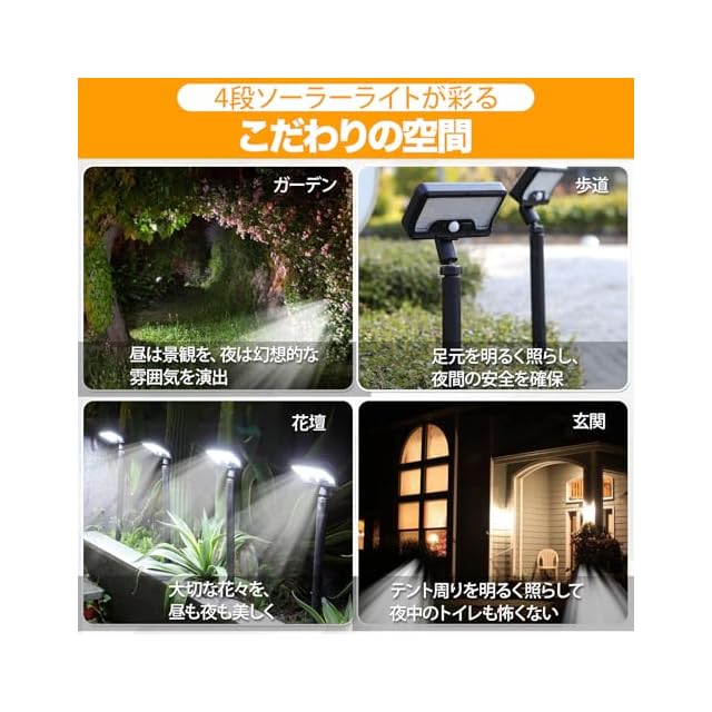 商品タイプ:ソーラーガーデンライト 4個セット 人感センサーモード 常時点灯モード 4つの設置高さ 高輝度の集光レンズ