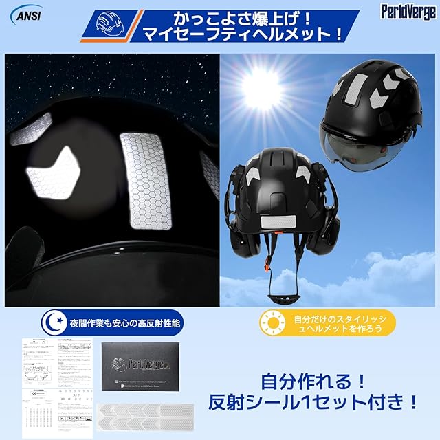 商品名:PerldVerge 安全ヘルメット ブラックヘルメットセット 職業用 クリアバイザーと耳栓付き 建設用 作業用 軽量 通気性 耐衝撃 夜光反射 防護帽 調整可能 アジャスタブル ヘッドバンド付き EN397規格準拠