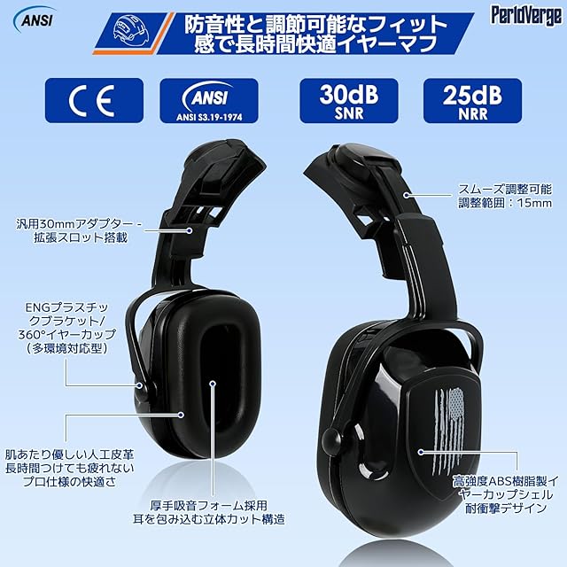 OSHA認証:高耐衝撃かつ貫通抵抗性に優れたABS素材で製造された当社の安全ヘルメットは、軽量で快適な装着感と優れた耐久性を両立しています。Perldverge 建設用ヘルメットはOSHA認証を取得しており、ANSI Z89.1 Type 1 Class C規格に適合しています。付属の防音イヤーマフはANSI S3.19 NRR 25db聴覚保護規格を、バイザーはANSI Z87.1-2015規格をそれぞれ満たしています。ANSI規格番号と製造年月日はヘルメットのつば内側に永久刻印されています