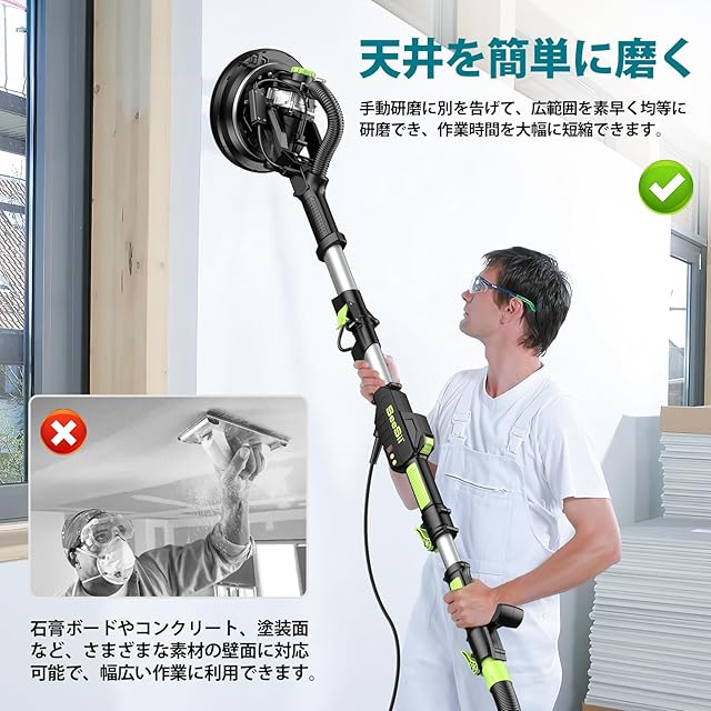 【バッケージ内容】電気ドライウォールサンダー本体(約3.5メートルの電源コード付き)、延長ポール×1、6枚のサンドペーパー(80/100/120/150/180/240)、2枚の無塵サンドペーパー、2m真空ホース×1、集じん袋×1、引きバネ×1、交換用カーボンブラシ×2、六角レンチ×1、ワッシャー×4、スポンジパッド×4、手袋×1、日本語取扱説明書×1。