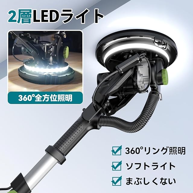 【二重LEDライト】ポールサンダーは二重LEDライトを搭載しており、360度の照明を実現します。夜間や暗い環境でも正確な研磨が可能です。柔らかい光で、作業面の状況を明確に確認可能と同時に、目にまぶしさを感じません。