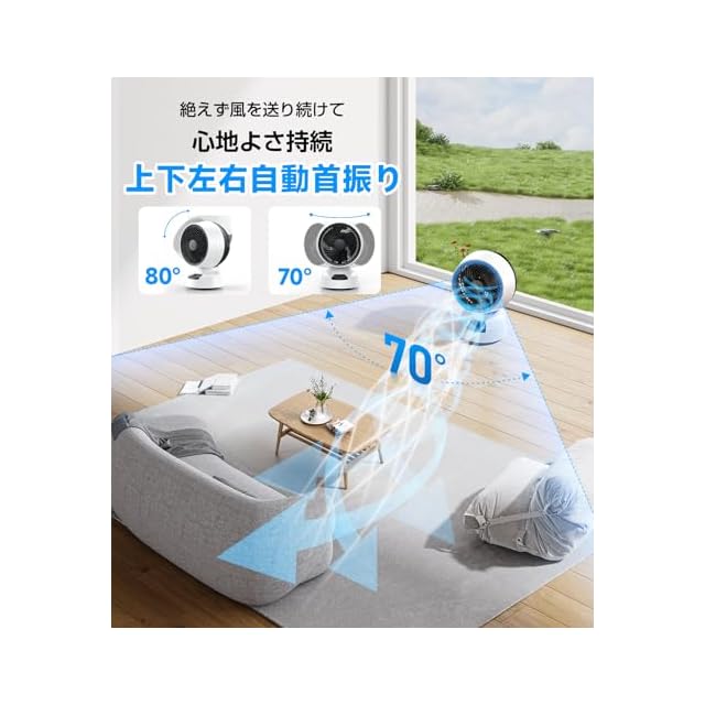 【DCモーターの圧倒的パワー&6段階風量調整】サーキュレーター DCモーターが従来AC比消費電力50%削減を実現!✨最新高効率モーターで最大風速5.3m/sの疾風を発生させながら、30畳空間をわずか10分で一掃6段階調節機能で、赤ちゃんの寝かしつけに最適な「そよ風モード」から、汗ばんだシャツを一瞬で乾かす「超強風」まで自在切り替え!25m先まで届く直進風が、部屋の死角まで空気をリフレッシュします。