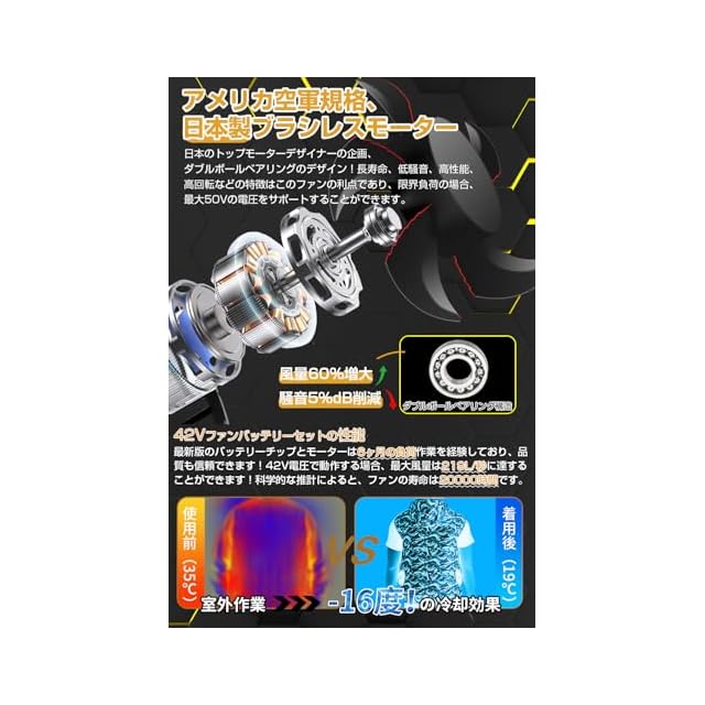 【Super Powerful!日本製ブラシレスモーター】風量増大と騒音低減を両立させるため、日本設計陣は高精度国産ブラシレスモーターを採用し、内部にダブルボールベアリングの構造があり、従来モデルのファンバッテリーセットと比較し、風量60%増大・騒音5%dB削減を実現しました。42V最大風量稼働時でも会話を妨げない静粛性を保持しながら、20,000時間の超長寿命を達成しました。ファンの羽根は鋸歯状設計で、空気の流れを速め、風量を大きくすることができます。ファンの保管については、ファンのフロントカバーが取り外し可能で、ファンの羽根を洗うのにも便利で、ウェットティッシュで拭くだけで十分です。