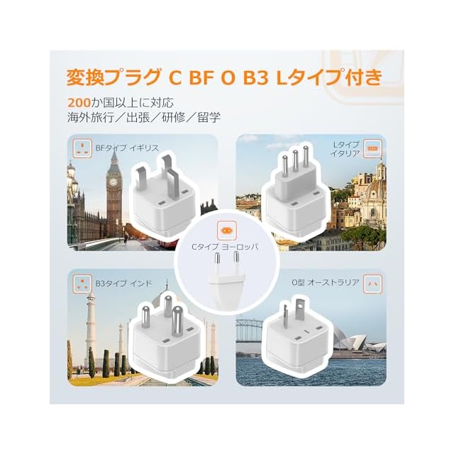【変圧器 海外旅行用】110v 220v 変圧器はcタイププラグ付き延長コート1本とBF・O・B3・Lタイプ変換プラグを備えています。韓国(一部)、イギリス、ヨーロッパ、イタリア、オーストラリア、フランス、ドイツ、スペイン、インド、クウェート、中国、香港、ポルトガル、ドバイ、イギリス、フィジー、アイルランド、アルゼンチン、ロシアなど、世界200カ以上の国・地域へ修学旅行に大活躍します。