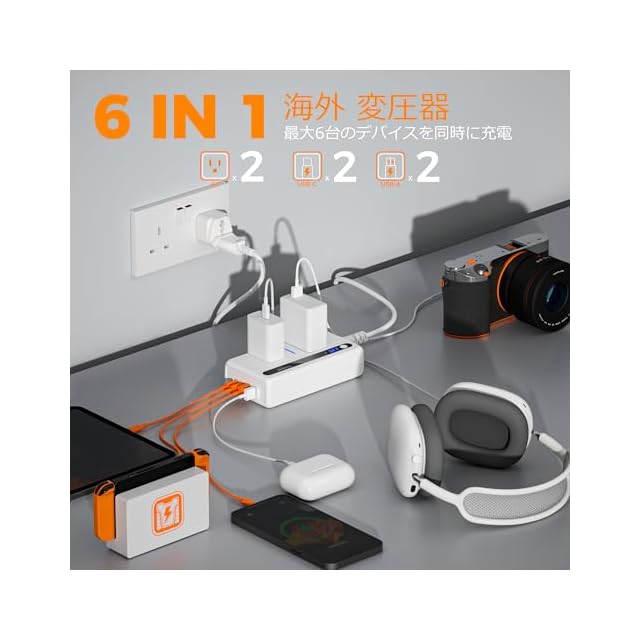 【6台同時充電可能】変圧器・変換プラグ・電源タップ・USB急速充電器が一体となった多機能タイプ。ACコンセント2口とUSBポート4口(USB-C×2)を備え、最大6台の機器を同時に充電できる電源変換器です。これ1台で各種アダプターが不要になり、荷物もすっきり。海外出張や旅行をより快適にお楽しみいただけます。旅行 便利グッズです。