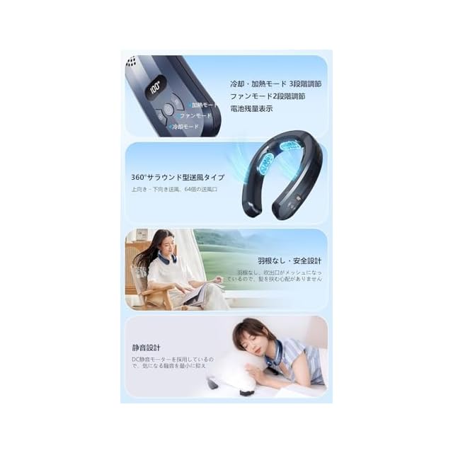 +【1年四季兼用!新世代ネックファン・冷却能力爆発!】2025年にデザインをアップグレードし、冬と夏の両用冷暖システムを搭載し、暑い夏と寒い冬を快適に楽しむためのスタンダード!3枚の冷却プレート、2つのメッシュファンを備え、二重構造で360度の涼しいサラウンドを実現しています。より広いの冷却範囲、より強い冷凍効果を提供し、数秒以内に感知温度を16℃下げる。冷蔵庫やワインセラーで使用されている「ペルチェ素子」を採用し、半導体冷凍チップ内蔵で、素早く「小型エアコン」に変身します。瞬間的な冷却、急速な冷却、熱中症予防に理想的なプレゼントです!一年四季兼用!加熱モードをオンにして急速に昇温することができ、寒い冬に着用するのに適しており、ホットタオルのように首にのせて、持続的な暖かさを楽しむことができます。
