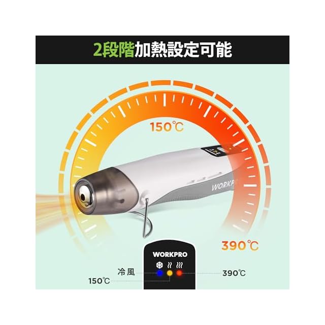 WORKPRO ヒートガン コードレス ホットガン 7.2V【加温新進化 】 小型タイプ ミニヒートガン USB充電式 150℃-390℃急速加温 2段階加熱可能 充電ライト付 過負荷保護 レジン気泡とり ステッカー剥がし 接合 補修 熱処理 乾燥 粘着 エンボス DIY 手芸用 熱工具