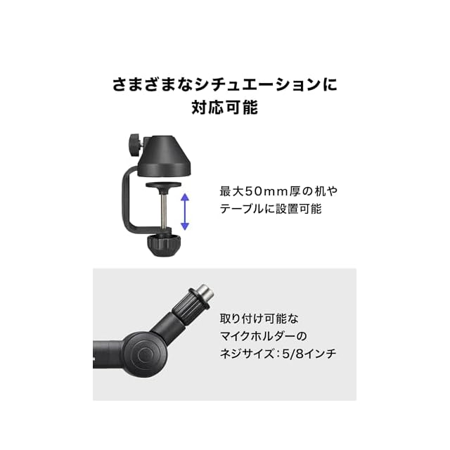 卓上環境に合わせたセッティングが可能:最大50mm厚のデスクやテーブルに設置可能です。ブームアームは水平方向に 360 度可動できます。アームの高さを約 14.5 センチ追加できる延長パーツを付属されております。