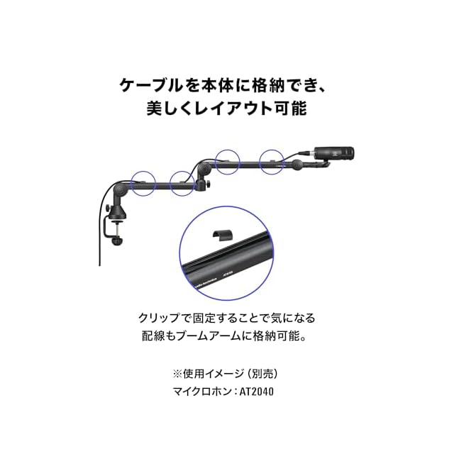 ケーブルを本体に格納でき、美しくレイアウト可能:本体のケーブルガイドにマイクロホンのケーブルを這わせ、クリップで固定することで気になる配線もブームアームに格納可能。デスク周りに美しくレイアウトできます。
