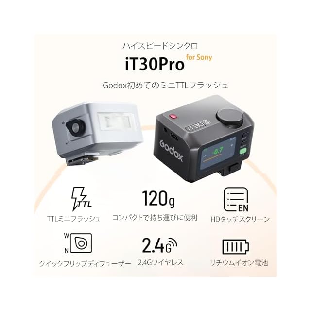 商品名:【日本語取扱説明書付き】Godox iT30Pro S カメラフラッシュ|タッチ式カラー液晶搭載|TTLオンカメラフラッシュ|コンパクトながら高性能|フル発光560回|2.4GHz無線マスター&スレーブ対応|S1/S2光制御|GODOX IT30 PRO S for Sony|わずか120gの軽量設計