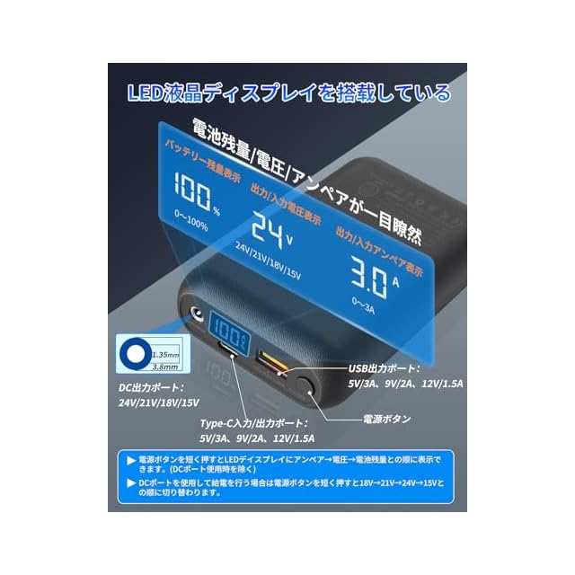 【手のひらサイズ!超長14時間稼働!LED液晶ディスプレイ搭載!】 詐欺せず、2025年20000mAh大容量持ちます!フル充電された空調作業服バッテリーが15Vモードで約14時間連続稼働が可能で、真夏でも長時間作業対応できます(連続稼働時間が実際の使用状況により異なります)。本体のサイズは:約11.10*7.03*2.90CM、重さ316gです。携帯便利で酷暑の屋外作業や旅行、出張などでのバッテリーとして非常に適しています。LED液晶ディスプレイ搭載しており、ワンボタンで電池残量/電圧/アンペアが一目瞭然!