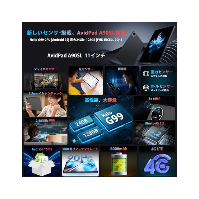 商品名:[タブレット 10インチ以上Helio G99]AvidPad 11インチ Android 15 タブレット 24GB+128GB FHD incell 90Hz IPS大画面SIMフリー Wi-Fiモデル 光センサ ジャイロ顔認識 GPS搭載 GMS/TELEC認証済 軽量510gフルメタルボディ日本語仕様書ゲームにも動画視聴にもプレゼントにも最適A90SL初登場