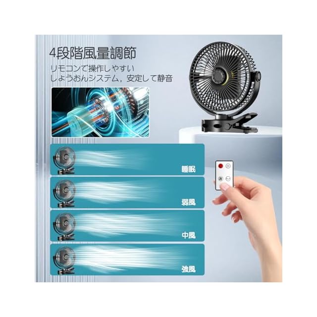商品名:【360° 自動首振り・15000mAh 電池】20cm 大口径充電式クリップ扇風機 57 時間連続使用 USB 給電 風量 4 段階 防蚊香りケース マイナスイオン リモコン付き LED ライト 真静音 卓上/車載/キャンプ対応 空気循環機能 日本語取扱説明書(ブラック)