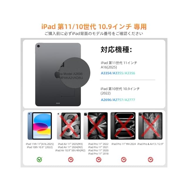 【対応機種】Bettdowのスマートキーボードは2025年発売のiPad A16 第11世代 11インチ (モデル番号: A3354/A3355/A3356) および2022年発売のiPad 第10世代 10.9インチ (モデル番号: A2696/A2757/A2777) に対応しています。スマート接続の接触位置が異なるため、お使いの iPad のモデルが当該キーボードと互換性があることを事前に確認してください。互換性がない場合は、使用できません。ご購入前に、iPad 背面のモデル番号をご確認ください 。