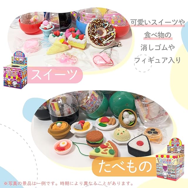 ●動物:一つのカプセルに動物マスコット2つ入り●恐竜:一つのカプセルに恐竜マスコットや消しゴム2つ入り●手品:手品グッズ1つ入り●スイーツ:スイーツのマスコットや消しゴム1つ入り●食べ物:食べ物のマスコットや消しゴム1つ入り●ミニカー:プルバックカー1つ入り●生産国:中国