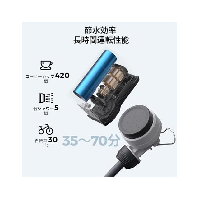 【デュアルモードシャワー】:2500mAhバッテリーを搭載。片手で低流量と高流量を切り替えられます。低流量では毎分0.37ガロン(約1.8リットル)の節水速度で最大70分間、高流量では毎分0.66ガロン(約1.8リットル)の節水速度で最大35分間使用できます。各モードは節水と到達距離を考慮しており、あらゆる屋外シャワーのニーズに応えます。
