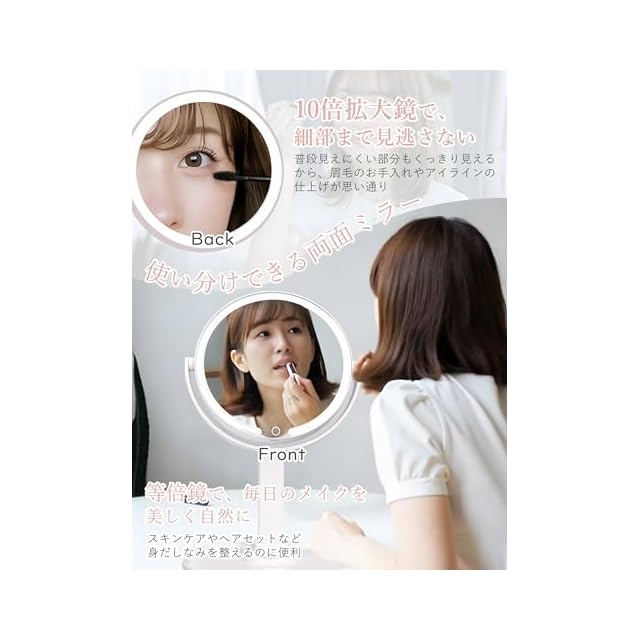 【両面鏡+10倍拡大鏡】この化粧鏡は、通常の鏡と10倍拡大鏡を両面仕様で搭載。アイメイクや毛穴チェック、コンタクト装着にも最適。卓上で使えるスタンドミラーとして、プロ級のメイク体験を提供します。