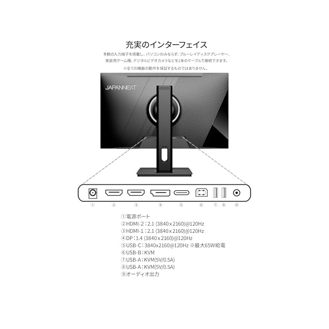商品名:JAPANNEXT 27インチ IPSパネル搭載 120Hz/1ms(MPRT)対応 4K(3840x2160)解像度 ゲーミングモニター JN-IPS27G120U-HSPC6 HDMI2.1 DP USB Type-C(最大65W給電) HDR400相当 sRGB:100% DCI-P3:95% PS5 4K:120Hz接続 VRR KVM 高さ調整 ピボット(縦回転) 【2年】