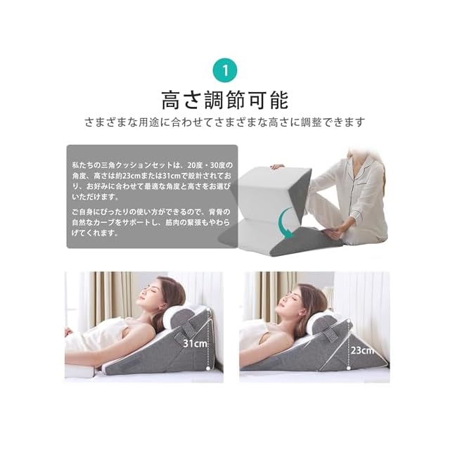 【7-in-1 調整可能なデザイン】この三角クッションスナップボタン付きで、高さを12インチから9インチに調整できます。この7-in-1調整可能なウェッジピローは、多様な快適さを提供し、さまざまなニーズに応えます。