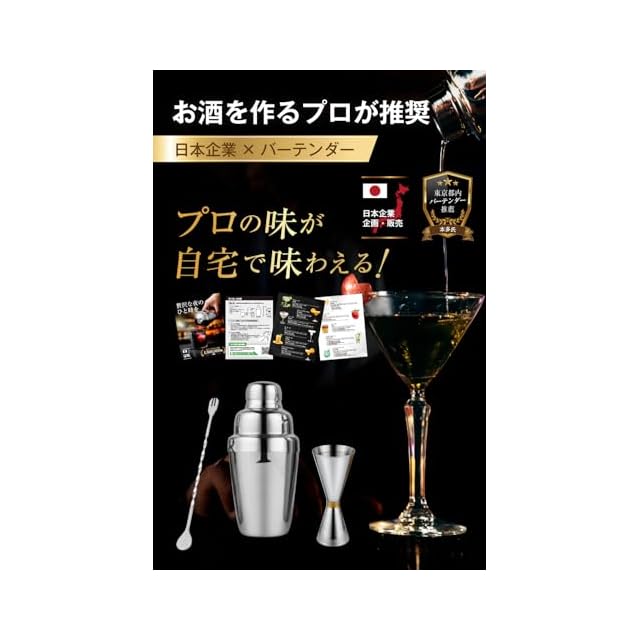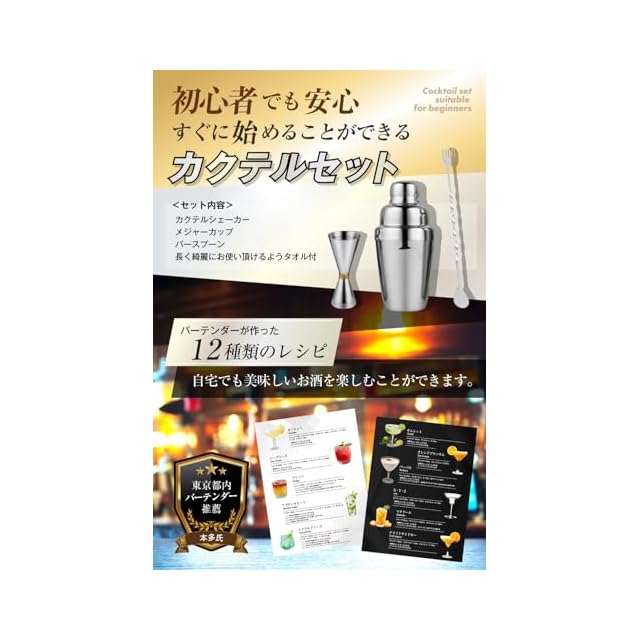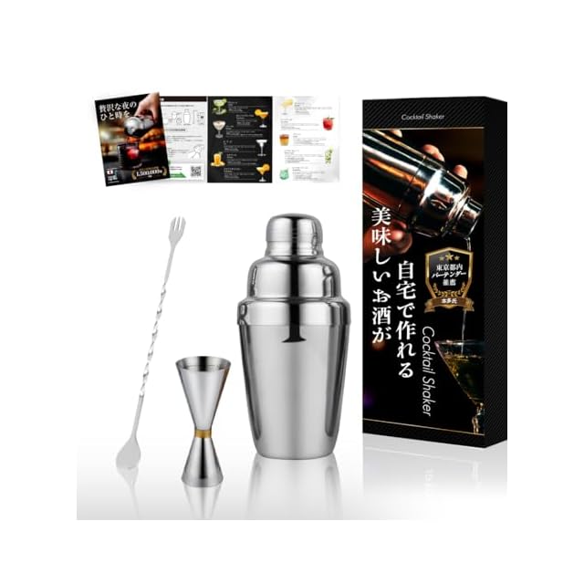 【贅沢な夜のひと時を】お仕事終わりに自分へのご褒美。自宅で気軽にカクテルを作ることができます。ご家族やご友人にも賄うことでより一層みんなで楽しむことができます。【現役バーテンダー監修のカクテルシェイカー】カクテル作りのプロが監修したカクテルシェイカーだから初心者の方から上級者までご利用頂けます。【初心者でも安心してカクテルが作れるようバーテンダーが作成したレシピ付き】カクテル作りが初めてな方でもレシピに分量が載っているからお家でお店の味を堪能することができます。【初めての方向け、カクテル3セット+タオルセット】初めての方でも使いやすい350mlの『カクテルシェイカー』、計量を測ることができる『メジャーカップ』、27cmある混ぜやすい『バースプーン』、綺麗に長く愛用して頂けるよう『タオル』も付属しており計4点セットです。【高品質のステンレス製】当商品は10年以上に渡ってステンレス製品を開発している工場で生産をしているため長く安心してご利用頂けます。【プレゼントとしてもご活用ができるようパッケージ付き】ご家族やご友人にプレゼントとしてもお渡しできるようにパッケージが付属しております。