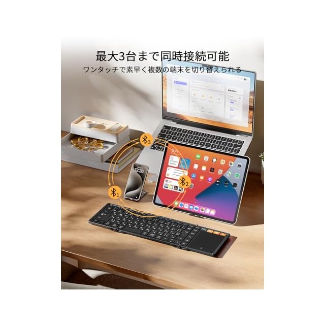 【3台同時接続可能&マルチOS対応】高性能と低消費電力を両立するBluetooth 5.1により、最大約10メートルの範囲で遅延なく安定した接続が可能です。また、折り畳みキーボードはWindows、 iOS、macOS、Androidど幅広いOSに対応しており、最大3台のデバイスを同時に接続できます。ボタン一つでスマホやタブレット、PC、iPad、iPad mini、iPad air、ゲーム機などの端末を素早く切り替えられます。複数のデバイスを頻繁に使い分けている方に最適です!