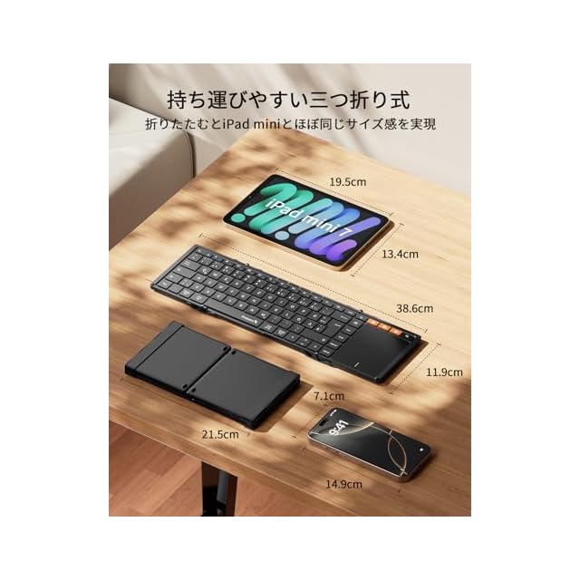 【三つ折り式&持ち運びやすい】作業の効率性と携帯性のバランスを考慮しながら使いやすさを追求したXK01 TP 折りたたみキーボードが新登場!重さは約297gと軽量でコンパクトなので、外出先や移動中の作業に非常に便利です。折りたたむとiPad miniとほぼ同じサイズになるため、使用しない時はカバンの隙間やパソコンバッグに簡単に収納できます。また、専用のPUレザー製収納バッグとスマホスタンドが付属しており、自宅だけでなく、カフェや図書館、オフィス、飛行機など様々な場所で快適かつ効率的に作業できます。(展開時サイズ: 38.58 × 11.89 × 1.22cm/折りたたみ時サイズ: 21.49 × 11.89 × 1.98cm)