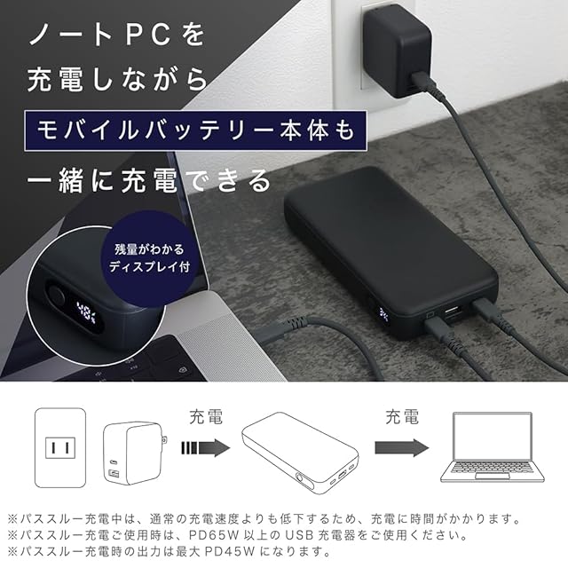 便利なパススルー機能付き:パススルー充電に対応しており、接続機器とバッテリー本体を同時に充電できます。 ひとつのコンセントで接続機器とバッテリー本体を同時に充電できます。 ※パススルー充電ご使用時は、PD65W以上のUSB充電器をご使用ください。 ※パススルー充電時の出力は最大PD45Wです。