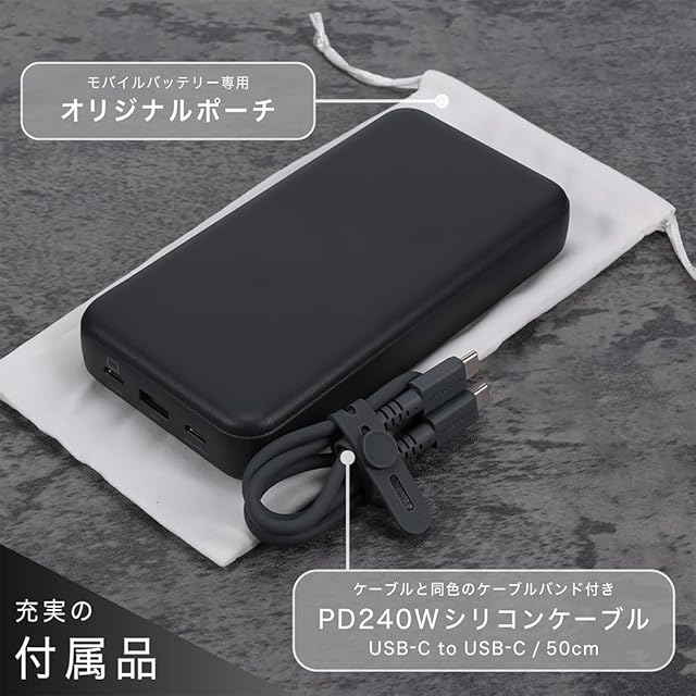 充実の付属品:専用ポーチとUSB-C - USB-C(PD240W対応)のシリコンケーブルが付いています。 ポーチはモバイルバッテリー本体とケーブルを一緒に整理して収納できるため、持ち運びやすく、出先で必要な時に素早く取り出して使用することができます。 ケーブルの長さは約50cmあるため、デバイスとの接続も十分に自由度があり、ケーブルが短すぎて使いにくいということもありません。