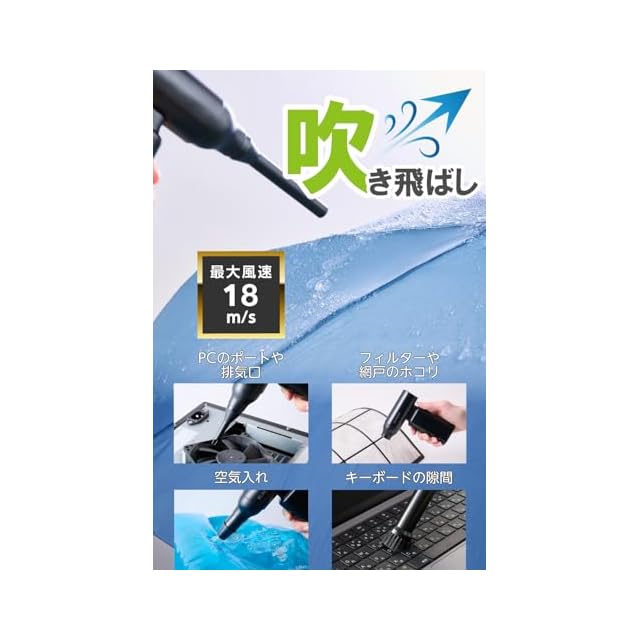 パソコンの画面やキーボードの隙間にあるホコリやゴミなどを強力な風で吹き飛ばし、パソコン周りをきれいに掃除できる電動エアダスターです。