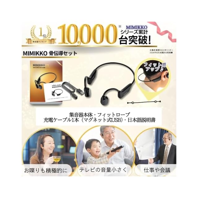 ✅プレゼントにも最適なスタイリッシュなMIMIKKO専用ボックス入り。骨伝導集音器セット内容:集音器本体(両耳用・音量変更は両耳共通)・充電用USBケーブル・フィットロープ・日本語説明書
