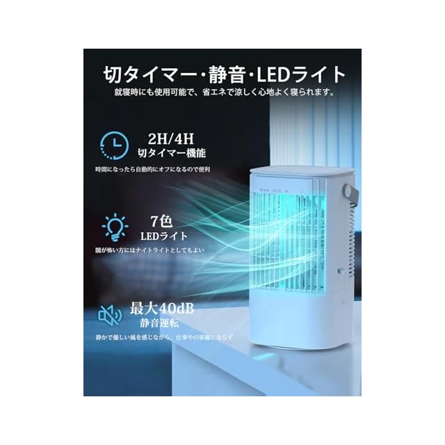 ❉彡【切タイマー機能・夜間ライト・静音】本冷風扇はタイマー機能を搭載して2H/4Hの設定区間があり、寝る時にタイマーを設定すれば時間になったら自動電源オフになり、涼しく心地よく寝られます。また連続運転6時間で自動停止する機能も搭載しています。7色LEDライトがリラックス雰囲気を演出、ふんわり噴出すミスト風が光をさらに引き立て、夜間に起きる時照明ライトとしても使えます。静音で通常使いで音は気になりません。就寝時も音を気にすることなくお休みになれます。