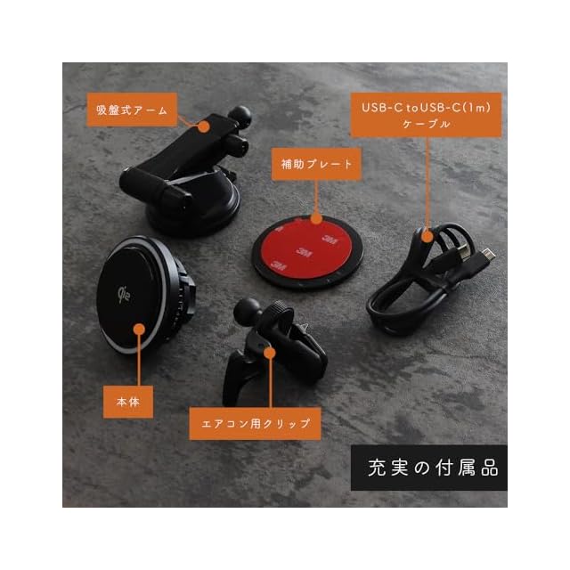 充実の付属品:充電器本体に加え、吸盤式アーム、補助プレート、USB-C to USB-C(1m)ケーブル、エアコン用クリップを付属。 車内のさまざまな取り付け環境に対応できます。