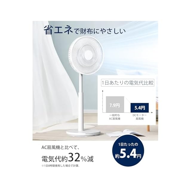 【静音デザイン&省エネ】Joy Pebbleリビング扇風機は静音設計で稼働中の騒音を最小限に抑え、最小32dBの静音運転で快適な睡眠環境を提供します。ACモーター扇風機やエアコンが1日にかかる電気代が数十円から数百円に対し、DCモーター搭載のJoy Pebble扇風機は一日の電気料がたったの5.4円です。財布にやさしい同時に、省エネルギーで環境にも優しいです。