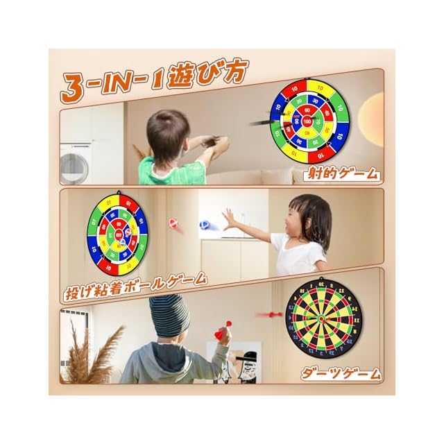 【3in1遊び方】: 従来のダーツボード玩具とは異なり、当社のダーツボードセットには、射的ゲーム、ダーツゲーム、投げ粘着ボールゲームの3つの遊び方があります。3種類のゲームを同時に楽しめるこのおもちゃは、お子様からご年配の方まで幅広く安全に楽しめる、三世代の家族みんなで遊べる人気のおもちゃです。家族や友人が集まる場で、楽しい時間を過ごせます!