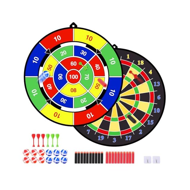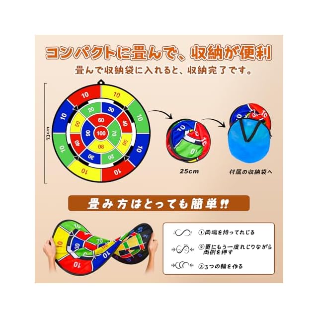 【超大判の両面式ダーツボード&折り畳み式】: ダーツボードは両面式で、表と裏でデザインが異なるため、1つのダーツボードで2倍楽しめます。また、子どもたちの数学スキル、手と目の協調、色彩認識、注意力を向上させるのに役立ちます!ダーツボードのサイズは超大判の73cm、ボールも投げやすい大きさ、小さな子どもでも的に当てやすいです。折り畳み式で、省スペース、軽量、コンパクトで持ち運びに便利です。室内でも外遊びでも、このおもちゃで簡単に楽しい時間をお楽しみいただけます!
