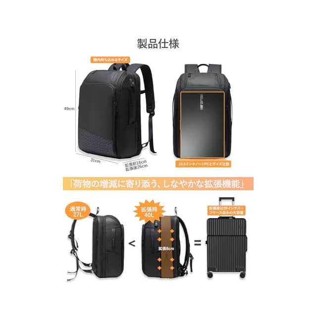 商品名:[Aerokyo] ビジネスリュック リュック メンズ 大容量 40L 旅行 機内持ち込み パソコン リュック 通勤 出張 A4 黒 拡張機能 撥水加工 USB 15.6インチ 17インチPC