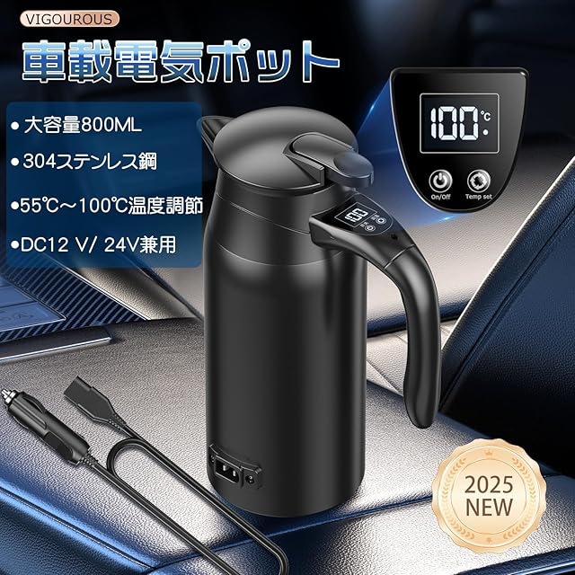【車載対応】迅速沸騰!車載電気ケトル 車用電気ポットDC12V-24V兼用 車用湯沸かし器 自動車加熱ボトル 800ml 軽量 車載 カップ LCD温度表示 55℃~100℃温度調節 沸騰/断熱/お茶作り/ブリューミルク 車中泊 湯ボルト アウトドア 長距離 家族ドライブ