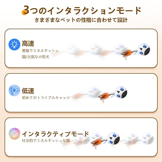 マウスゲーム: インタラクティブな猫のおもちゃのボールには、猫の前で振ったり揺らしたりする羽のしっぽが付いており、小動物のランダムな動きを模倣し、音を発したり LED フラッシュを発して猫の注意を引き、猫が追いかけたり、ジャンプしたり、走ったりするように促します。猫ちゃんに「自然な」遊びを体験させて、現実感と満足感を高めましょう。素早くランダムな動きを通して、猫が余分なエネルギーを消費し、元気で健康な状態を保つのに役立ちます。
