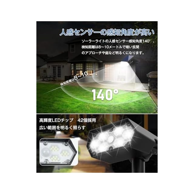 商品名:センサーライト 屋外 防水 人感センサー ソーラー スポット ガーデンライト 自動点灯 防犯 昼光色 42LEDs 高輝度 2200mAh大容量バッテリー IP65防水 ガーデン 玄関 庭園 車道 歩道 駐車場 屋外 照明 2個セット