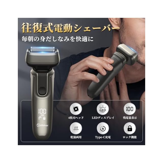 【革新的な4枚刃・忙しい朝も、素早く剃り残しゼロへ】上下左右に独立して動く4枚のフローティングヘッドが肌にぴったり密着し、顎や鼻下など顔の複雑な曲線を効率よく深剃りし、従来の3枚刃のシェーバーと比較して効率がUP!さらに、自動研磨システムが搭載され、毎回鋭い切れ味を保ち、肌への負担も抑えます。高品質ステンレス鋼製刃も採用され、耐久性に優れています。 【パワフルなモーター・毛を引っ張ることが心配なし】電気シェーバーは、10000rpmリニアモーターを内蔵しており、強力な回転力でひげを剃り上げます。カールしていたり寝ていたりするひげも逃さずにスッキリと深剃りし、顔をツルツルに仕上げます。忙しい時でも一気にひげを素早くきれいに整理できます。AI 技術を搭載しており、ひげの濃密さと硬さを自動的に感知して出力を調整します。 【乾湿両用・お手入れ簡単】ウェット剃りとドライ剃りの両方に対応した乾湿両用設計で、シェービングフォームやジェルを使った肌にやさしい剃り方にも対応します。シャワーと一緒にシェーブできるので、いっそう肌に優しくシェービングでき、時間を短縮します。きれいにする時は、まずブラシできれいにしてから、ヘッド部分を水で洗って、もっときれいにすることができます。 【LEDディスプレイ・一目で状態を確認】電動シェーバーの視認性抜群の液晶ディスプレイを搭載し、バッテリー残量・充電中・水洗いリマインダーを一目で確認できます。これにより、充電のタイミングを把握し、使用が中断しないようにできます。また、電源ボタンを3秒長押しするとロック状態になり、突然の起動や外出時の誤操作を防ぐだけでなく、お子様の誤操作も防止します。 【Type-C急速充電・5分クイックチャージ】大容量バッテリーを内蔵し、フル充電で60分間の連続使用が可能で、毎日2分使用なら約30日間利用できます。国際標準インタフェース付きUSB充電線は、PC、モバイル電源や車載USBポートから充電することもでき、アダプター(5 V/1 A)を接続して自宅のコンセントで充電することもでき、出張、旅行、オフィスでも電力がなくなる心配はありません。
