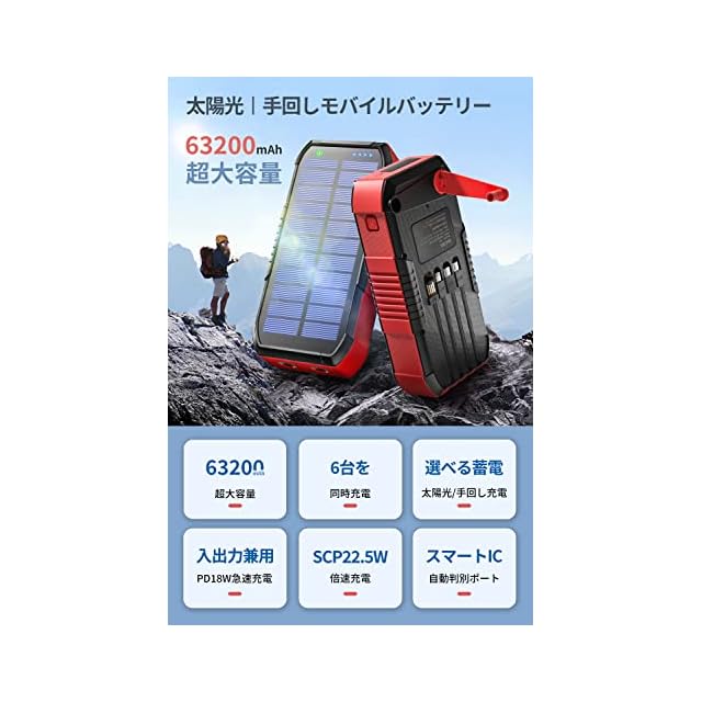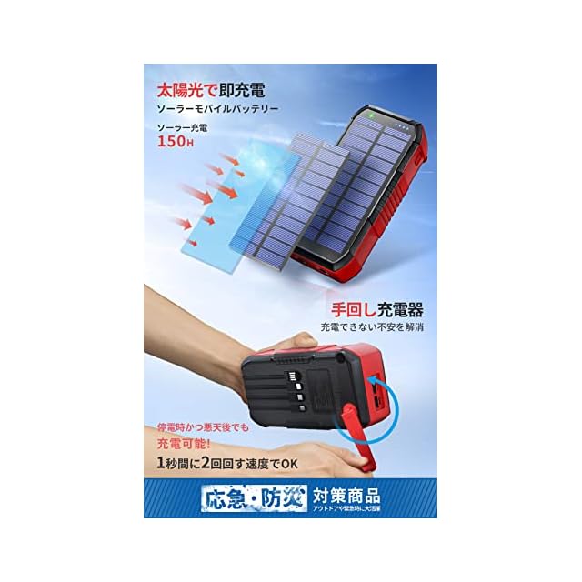 商品名:【63200mAh 22.5W/PD18W急速充電】 ソーラーモバイルバッテリー 大容量 4本ケーブル内蔵 手回し充電 IPX7防水 防塵 ソーラーチャージャー 6台同時充電 5way蓄電 LEDライト付き モバイルバッテリー コンパス搭載 耐衝撃 ソーラー充電器 スマホ 充電器 地震/災害/旅行/アウトドア/緊急用 防災グッズ iOS/Android各種他対応 (赤黒)