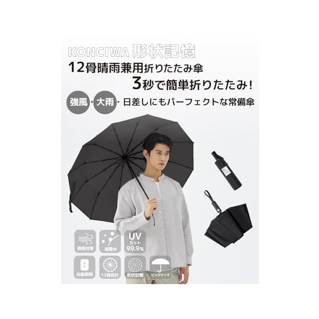 商品名:Konciwa 3秒でたためる傘 形状記憶 超大サイズ・12本骨 折りたたみ傘 メンズ ワンタッチ 自動開閉 晴雨兼用 380g 折り畳み傘 おりたたみ レディース ワンタッ 撥水速乾 耐強風 男女兼用 携帯しやすい