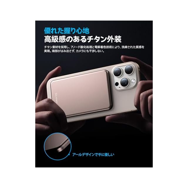 【チタン素材ならではの高級感】 このモバイルバッテリーは、高品質なチタン素材を採用し、環境にも配慮します。アノード酸化処理と電解着色技術により、落ち着いた色合いと上品な光沢を実現し、見た目だけでなく、触れた瞬間にも高級感を感じさせます。丸みを帯びたデザインが手にフィットし、快適な持ち心地を提供します。