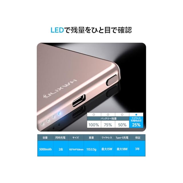 【薄型・超軽量で持ち運びが簡単】このモバイルバッテリーは、薄型かつ超軽量な設計(9.8mm、115±5g)で、コンパクトなポケットサイズに仕上がっています。日常の通勤や海外旅行、出張など、あらゆるシーンで持ち運びが楽々です。機内持ち込み可で、旅の途中でも楽にご利用いただけます。そして、LED 表示灯で充電状況や残量が一目でわかり、便利です。