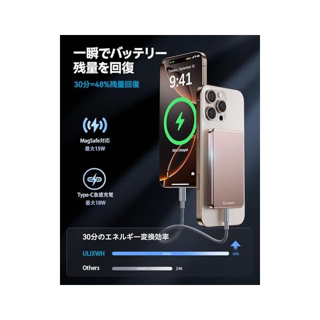 商品名:【業界初のチタン素材・MagSafe対応】モバイルバッテリー 軽量 小型 マグセーフ対応 5000mAh ワイヤレス マグネット式 18W急速充電 Type-C対応 FCC/PSE認証済み iPhone16/15/14/13/12シリーズ対応 パススルー機能 機内持ち込み可 MagS-1 ULiXWH(デザートゴールド)